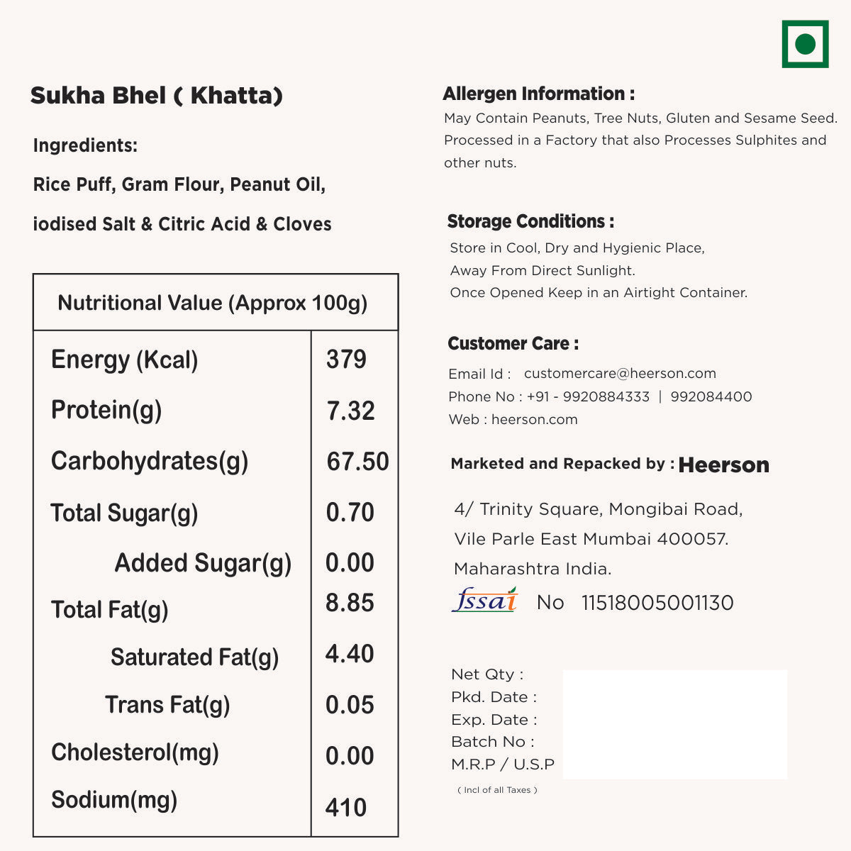 Heerson's Sukha Bhel ( Khatta ) is a perfect combination of Tangy and Crispy, This Zesty number is a treat to the tastebuds and is a popular choice for Namkeen lovers all over the country.