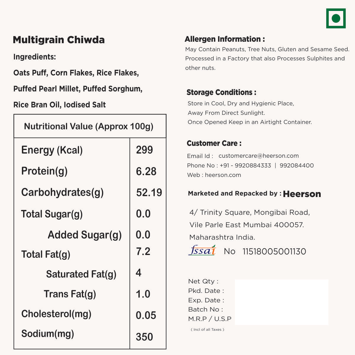 Made from Oats Flakes, Cornflakes, and other healthy grains, Heerson's Multigrain Chiwda is a low-fat snack full of good carbohydrates which is delicious in taste and low in Calories, Enjoy this snack at revel in its taste anytime.
