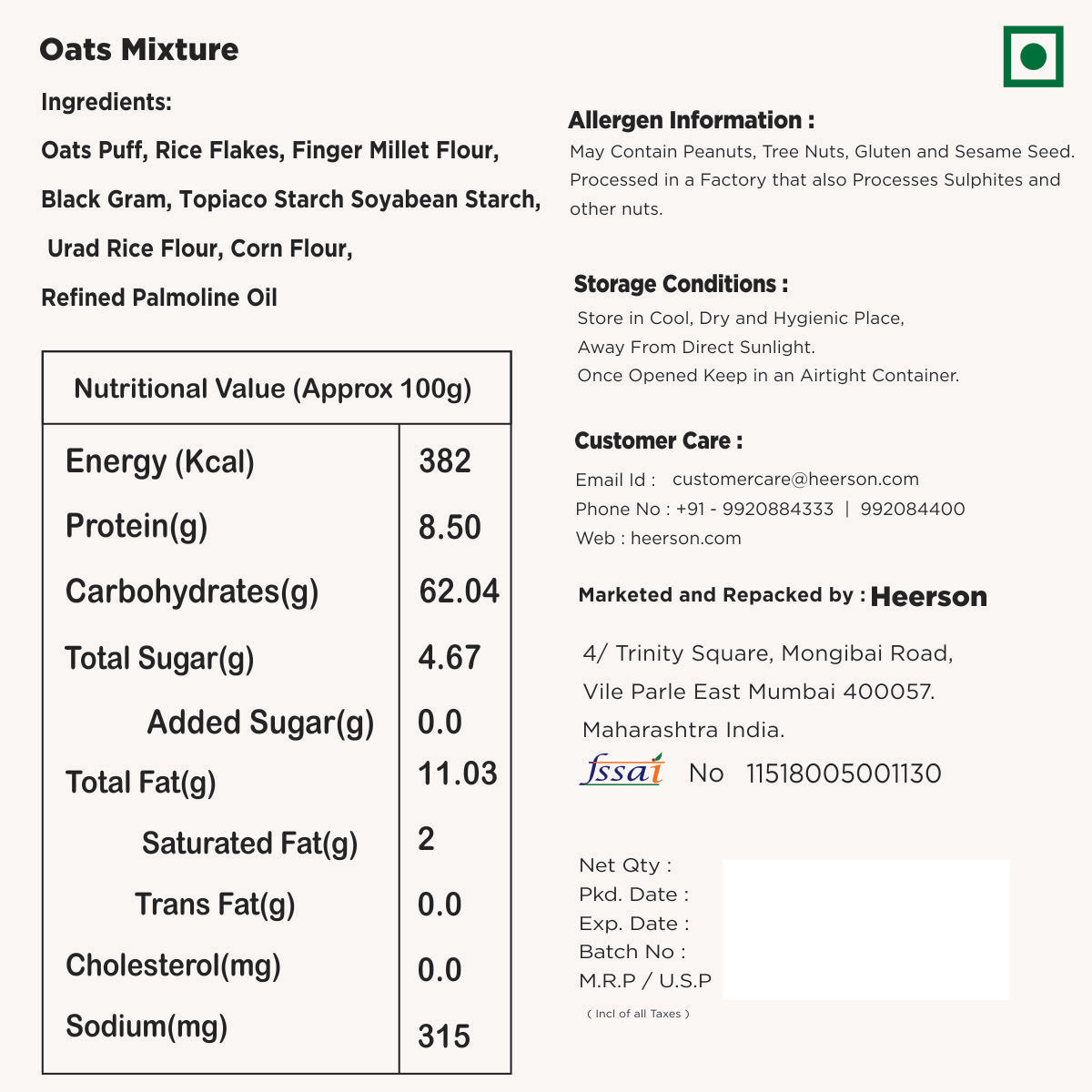 Made from Oats Puff, Rice Flakes, and Soyabean mixed with spices, Heerson's Oats Mixture is a healthy and low-fat snack that is delicious in taste and low in Calories, A Long-Lasting and Delicious Time Pass/Functional Snack which can be enjoyed anytime you want.