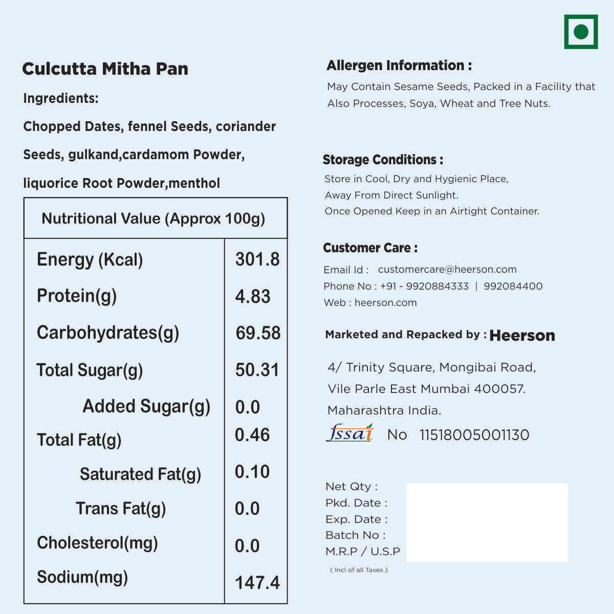 Heerson's Culcutta Mitha Pan made from Betel leaves, Rose petals, dry dates crystals, menthol, cloves, cardamom, and fennel seed is a delectable mouth freshener that is popular for its sweet minty, and exotic taste, Revel in the delicacy and satisfy your taste buds with this super refreshing mukhwas.