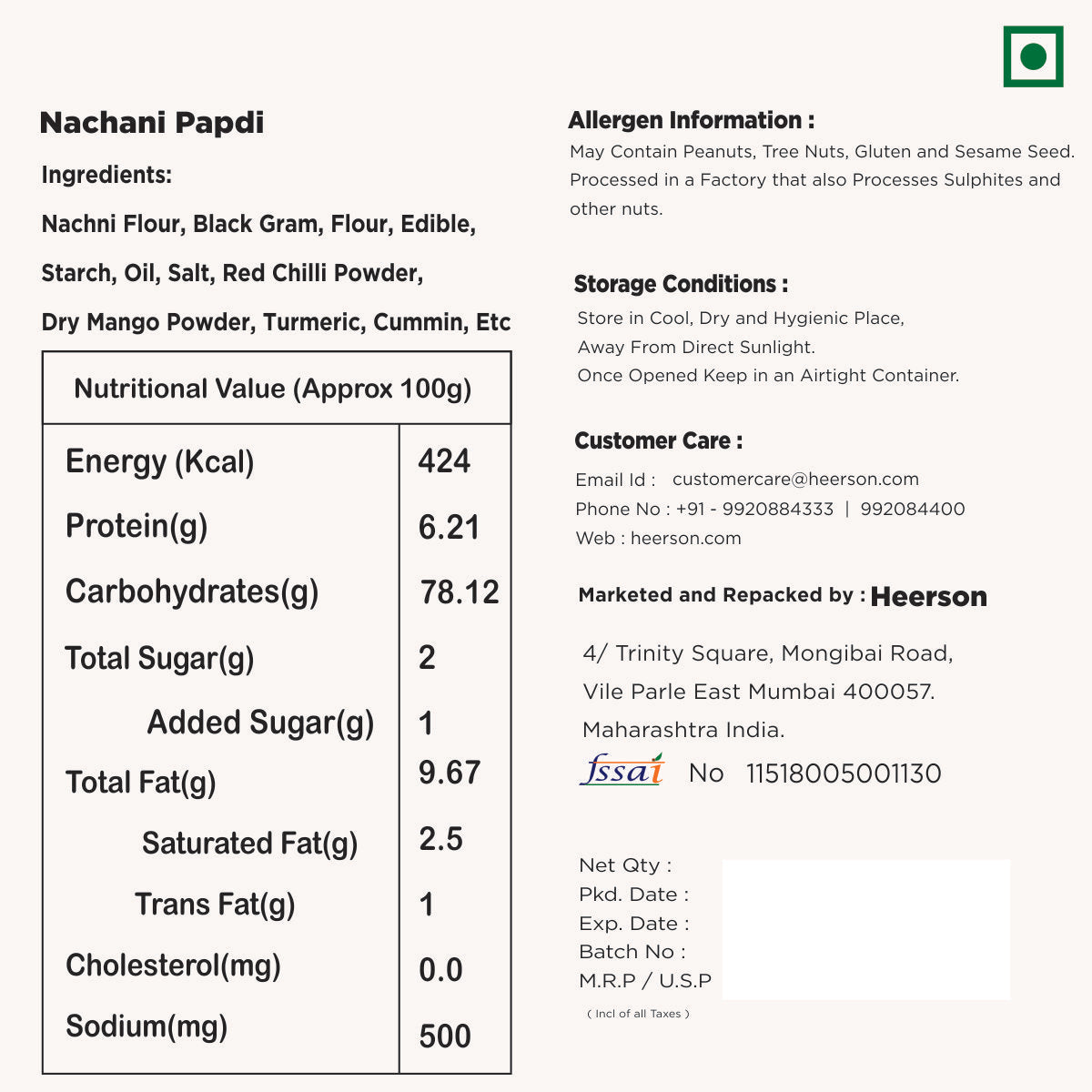 Heerson's Nachani Papdi bring you the best of taste and crunch, Made from Finger Millet which is a great source of calcium and good fiber ,This delicious snack can be enjoyed anytime you want .